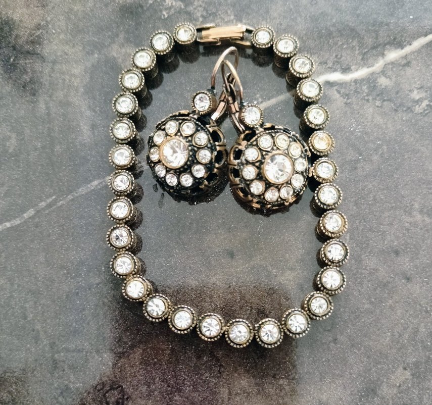 Vintage tarzda, altın renkli desenli bileklik ve gri taşlı payetli küpelerden oluşan kadın takı seti, düğünler için uygundur. sorunsuz elmas konturlu