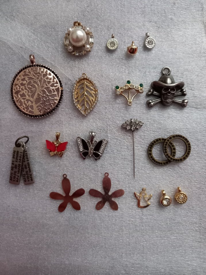 Vintage tarzda, işlemeli ve payetli açık altın renkli kadın charm seti. Yaprak, kelebek ve klasik motifler içerir, günlük kullanım için uygundur. ✨