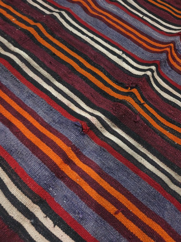 iki adet mevcut 1960lar üretim ölçüler 180/142 25 metrekare Bu bohem halı, koyu tonlarda çok renkli çizgiler içerir. Çizgili deseniyle her mekâna canlılık katar.