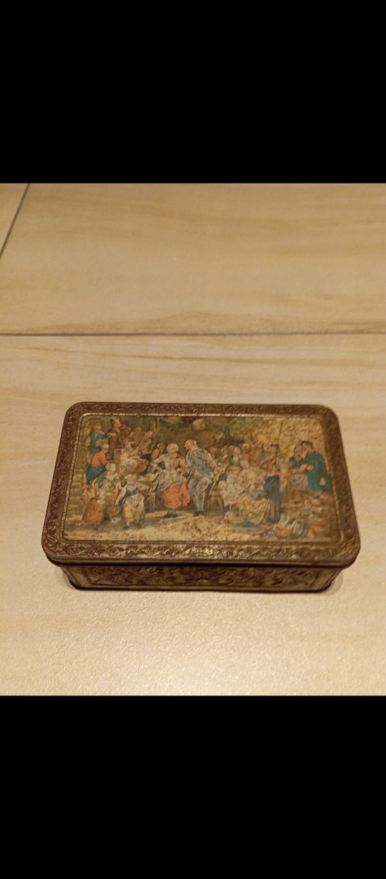 Kapağında barok resim baskısı bulunan,yanları kabartma ince işçilik detayları buounan koyu kahverengi vintage/antik metal kutu (ürün ithaldir)