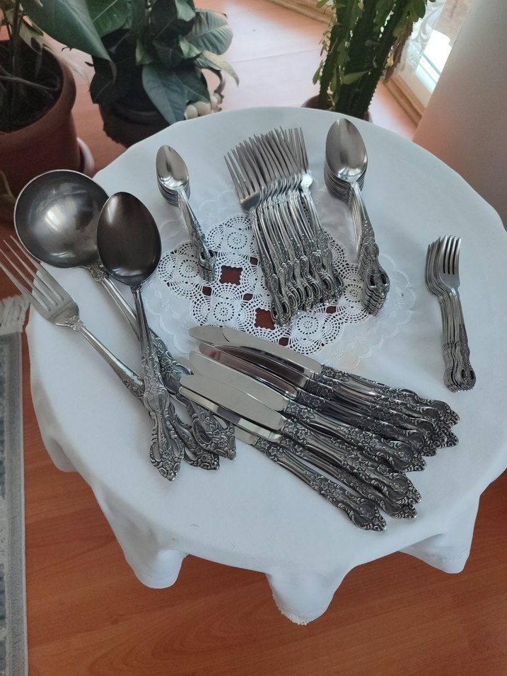 Stainless Steel German Model 63 parça hrosi 12 şer li Gri ve beyaz tonlarda detaylı saplara sahip çatal, bıçak, kaşık ve kepçe seti.