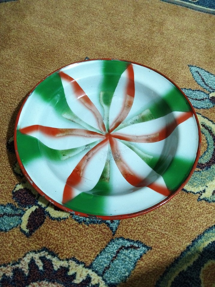 Yeşil, beyaz ve turuncu renklerde batik desenli, klasik yuvarlak şekilli renkli tabak, Avrupa emaye tabak, nadir üründür