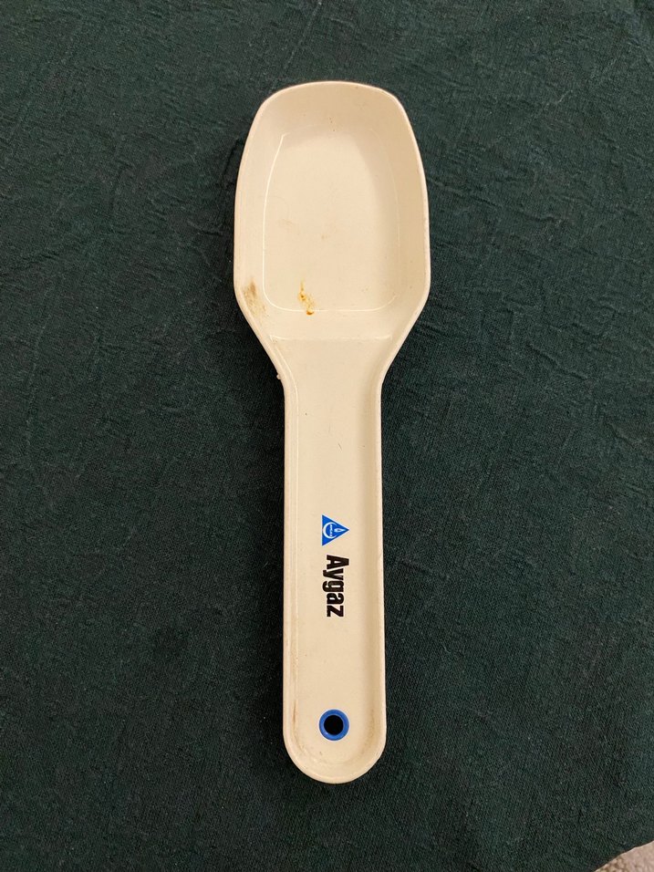 Beyaz plastik kaşığın sapında Aygaz logosu bulunur. Koleksiyonluktur.