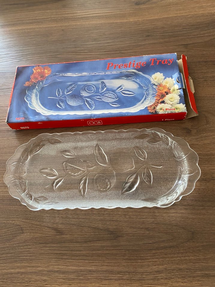 Vintage tarzda, renkli ve baskılı yaprak desenli şeffaf servis tabağı. Şık sunumlar için idealdir . Kıbrıs’tan almıştım. Hiç kullanmadım. İhtiyaç fazlası