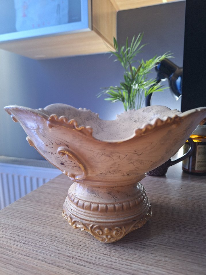 Bej renginde, ayaklı ve kenarları dalgalı dekoratif vazo, klasik bir dokunuş için ideal.