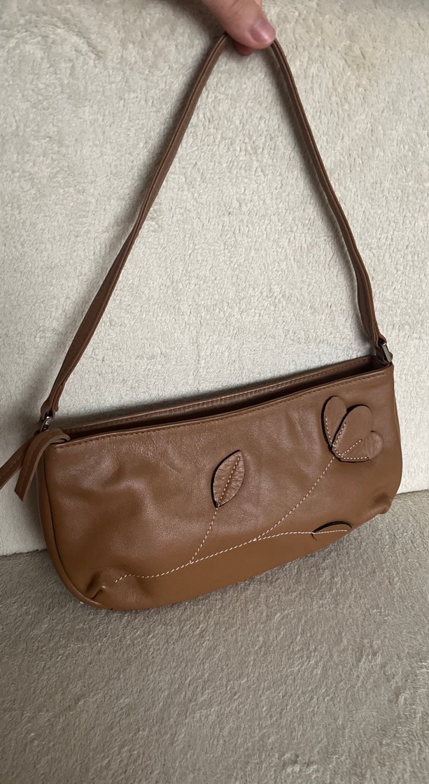 Bej deri omuz çantası, fermuarlı üst kısmı ve minimal tasarımı ile dikkat çekiyor. Nakışlı yaprak ve kalp detayları bulunur. Günlük kullanım için uygundur.