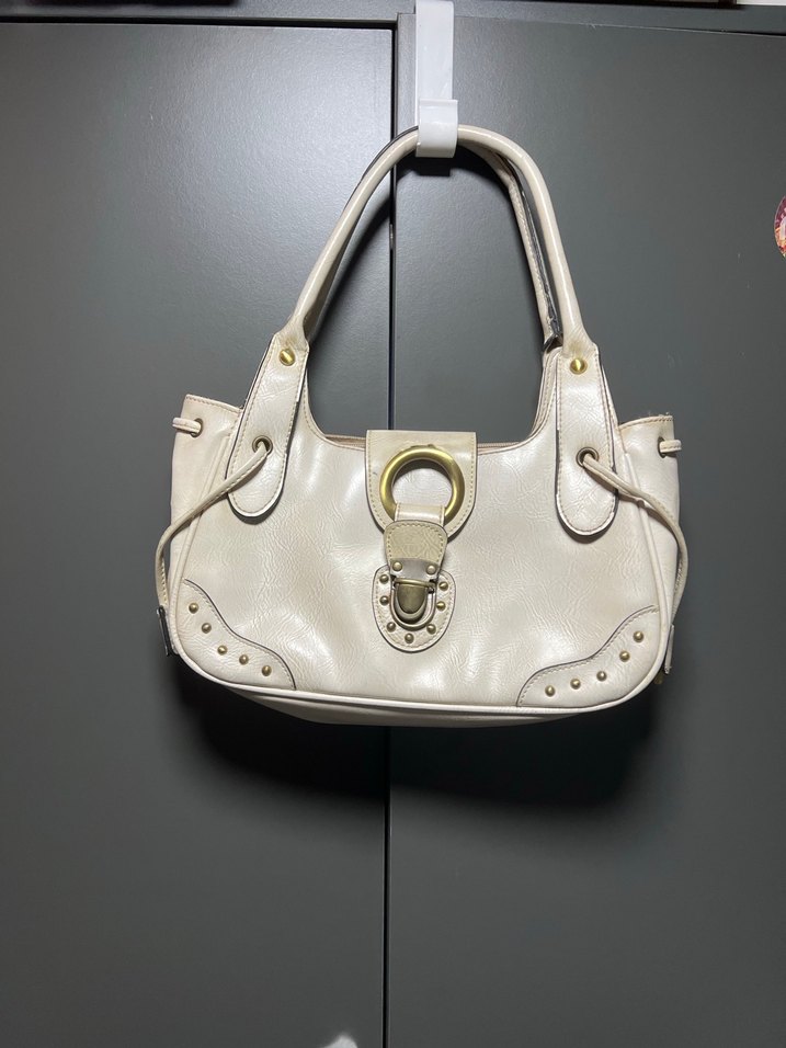 Bej deri çanta, tokalı tasarımı, altın renkli aksesuarları ve perçin detaylarıyla modern klasik şıklığı yansıtıyor. son fotoğrafta ufak bir defosu var.