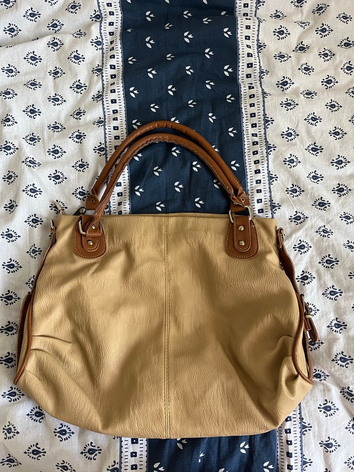 Açık bej renkte deri kadın çantası, tokalı sapları ve deseniz yüzeyi ile günlük kullanım için uygun. Bohem tarzda, Paris etkisiyle.