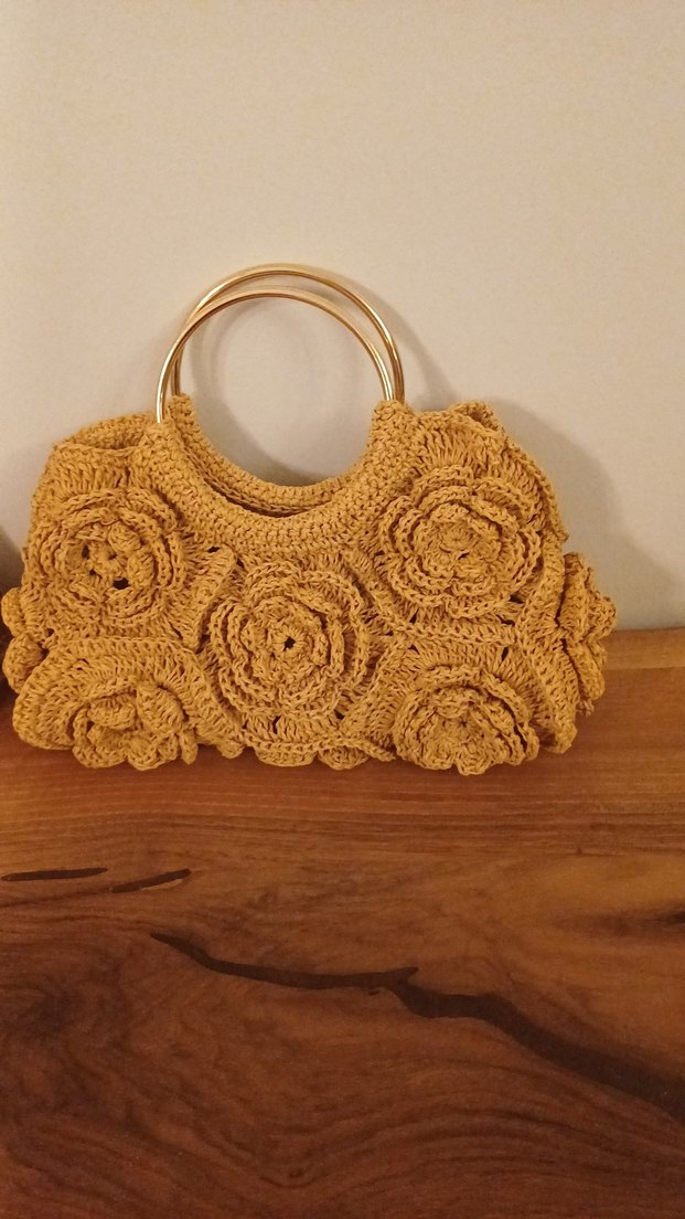 Bej renkli, örgü çiçek detaylı ve dantel süslemeli, yuvarlak metal saplı bohem vintage tarzda kadın çantası. siparişle örüyorum hazırda yok teslimat süresi sorunuz