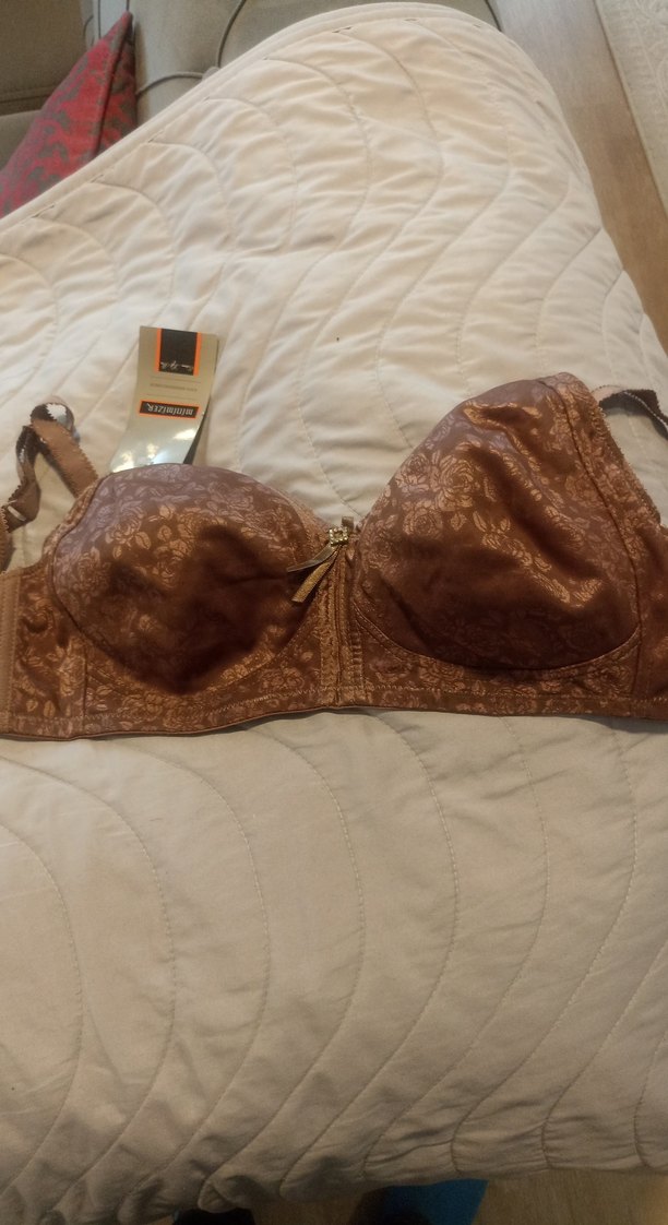 Bej renkli, vintage bohem tarzda, parlak yüzeye sahip sütyen. Desensiz ve normal uzunlukta destek sağlar.