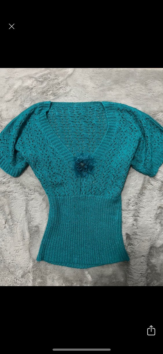Turkuaz renkli, V yakalı, kısa kollu, örgü kadın kazak. Rahat ve desen içermeyen, günlük kullanıma uygun bohem tarzda bir modeldir.