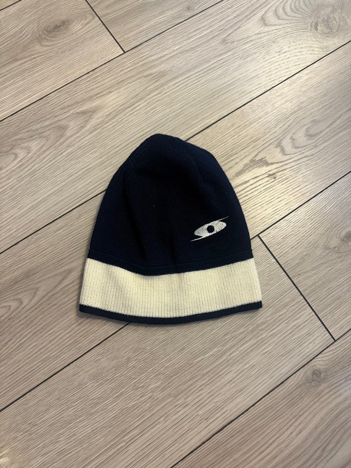 Kadınlar için örgü siyah bere, alt kısmında beyaz bant bulunur. Yumuşak örgü kumaştan yapılmış, sade stil ve küçük nakış detayıyla sokak modasına uygundur.