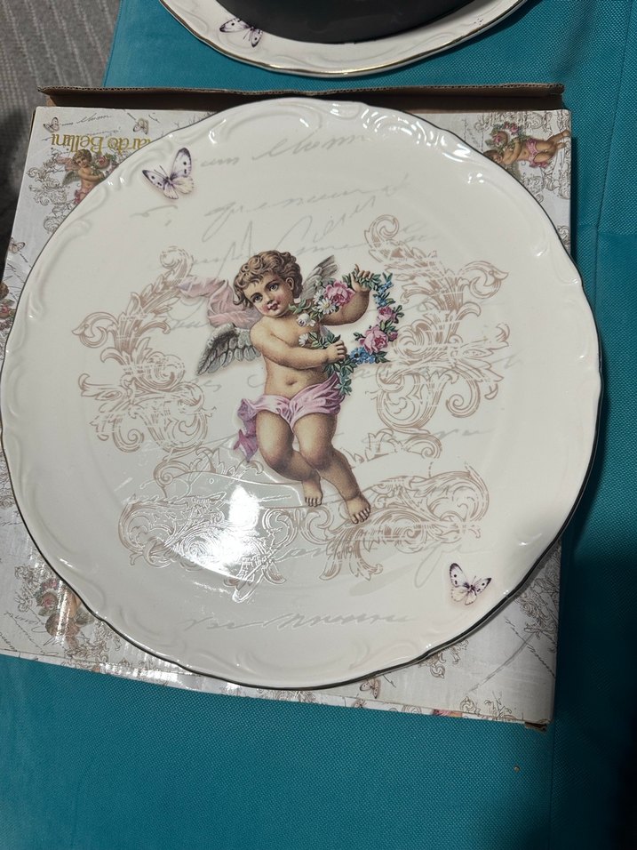 bernardo fincan fine porcelain melek figürlü fincan seti. 12 adet var. İki takım için iki adet tepsisi var. Sağlam. Bir adet fincanın kulbu ve tabağın kenarı kırık. Porselen yapıştırıcı ile yapıştırıp kullanılabilir hale getirilecek. Fotoğrafını yükledim. Takım olarak satılacaktır.