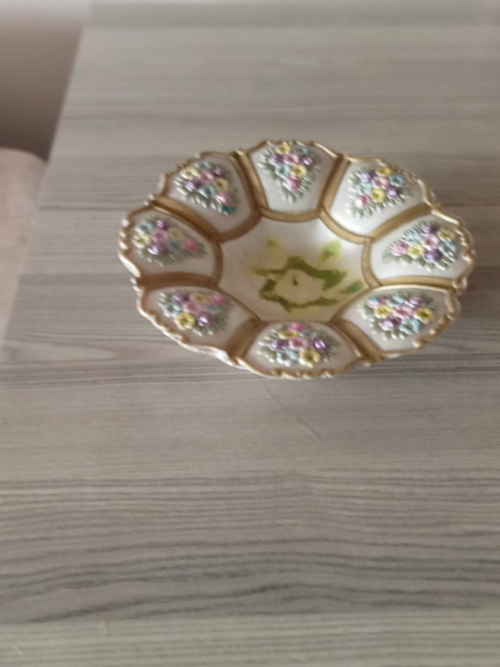 Vintage tarzda alcı beyaz tabak, pastel renkli çiçek desenleri ve altın detaylarla süslenmiştir. ️