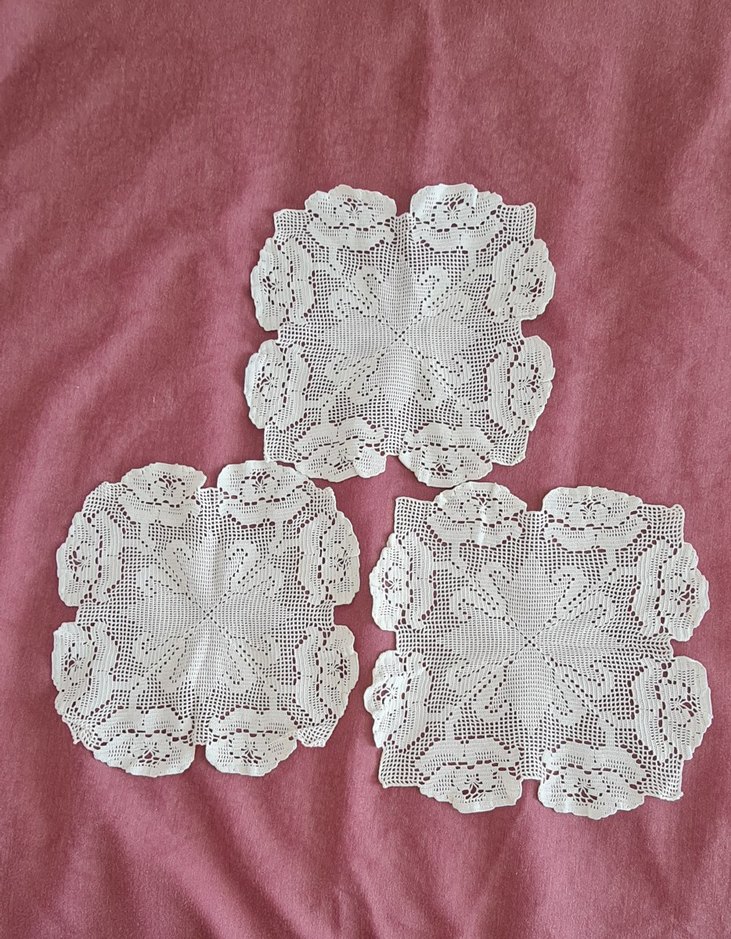 Vintage beyaz dantel el işi örtüler, detaylı çiçek desenleriyle süslenmiş. Dekoratif kullanım için uygundur. 3 parça olup 35 cm civarı