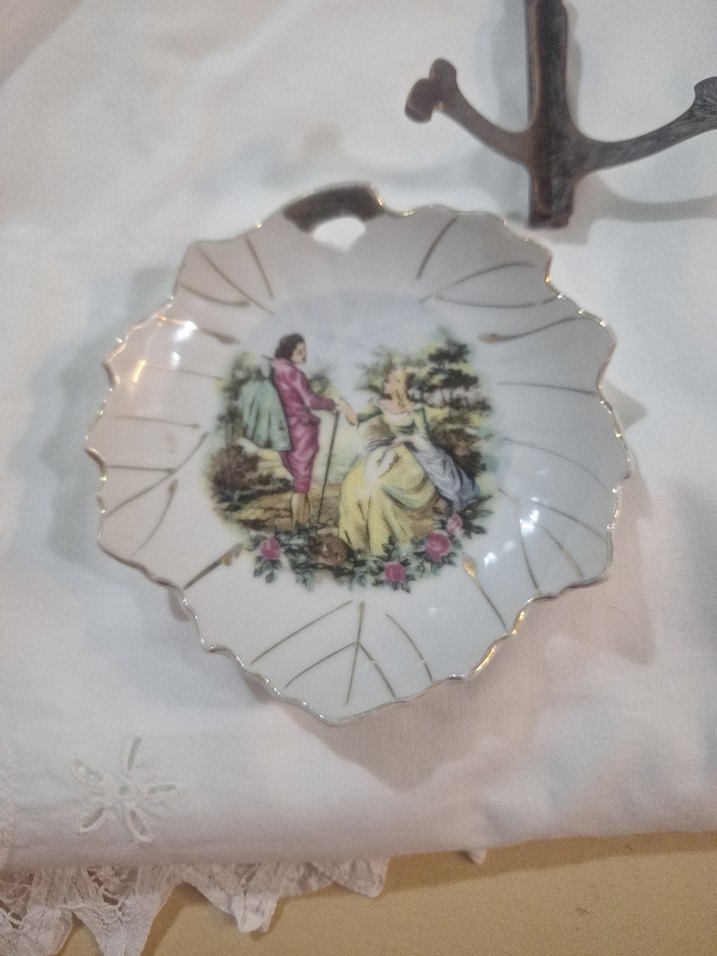 vintage Altın detaylı beyaz porselen tabakta kraliyet döneme ait kıyafetlerle çift figürü yer alıyor. Ninemden kalma☺️