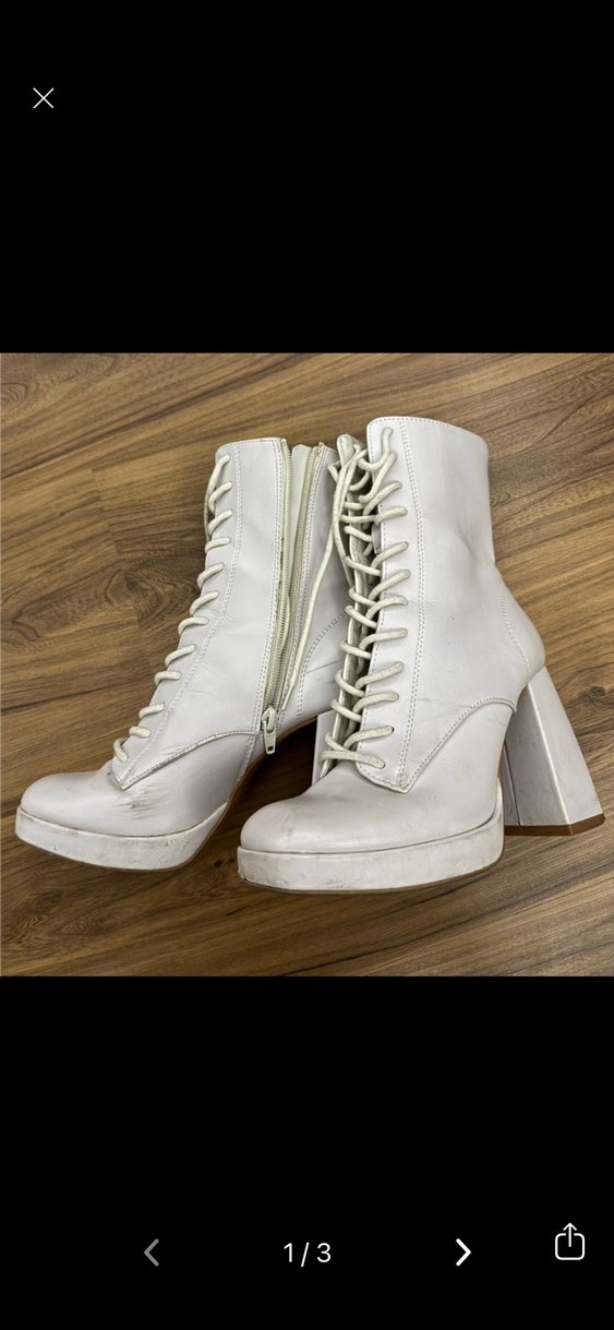 Vintage tarzda, beyaz deri, platform topuklu kadın botları. Bağcıklı ön ve yan fermuarlı, tokalı detaylara sahip. Romantik akşamlar için uygun.