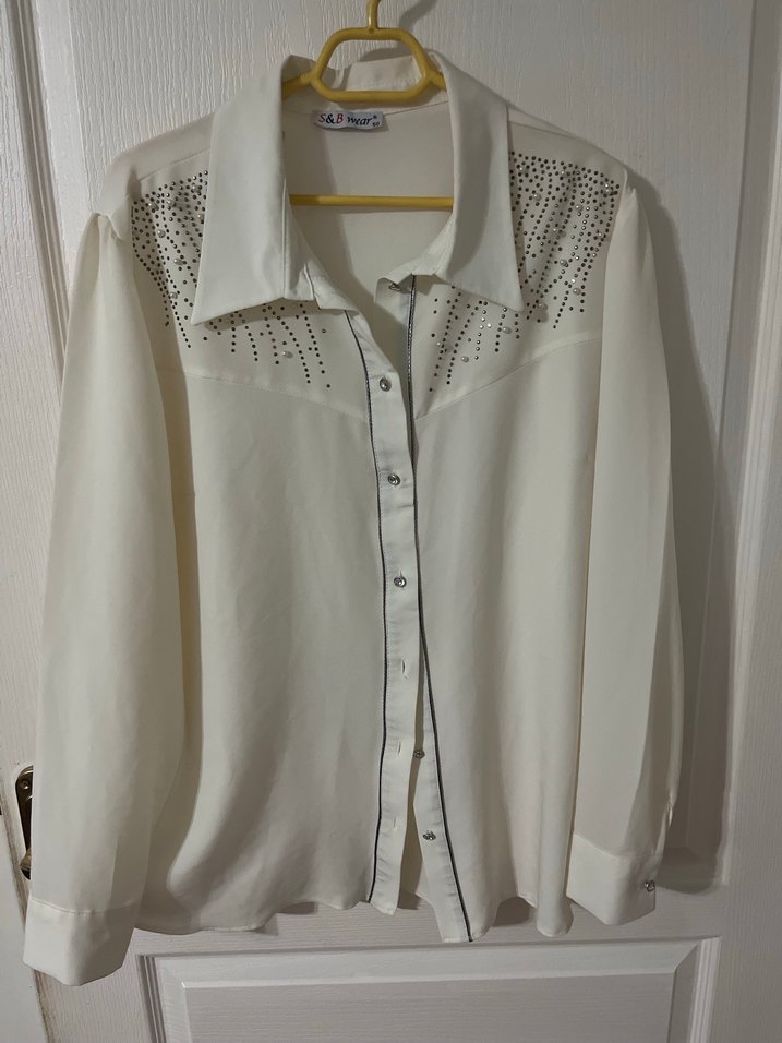 Vintage tarzı beyaz kadın gömleği, uzun kollu ve düğmeli. Pamuklu, parlak dokulu ve bol kesim, ofis kullanımı için uygun. ✨ 1 kez giyildi