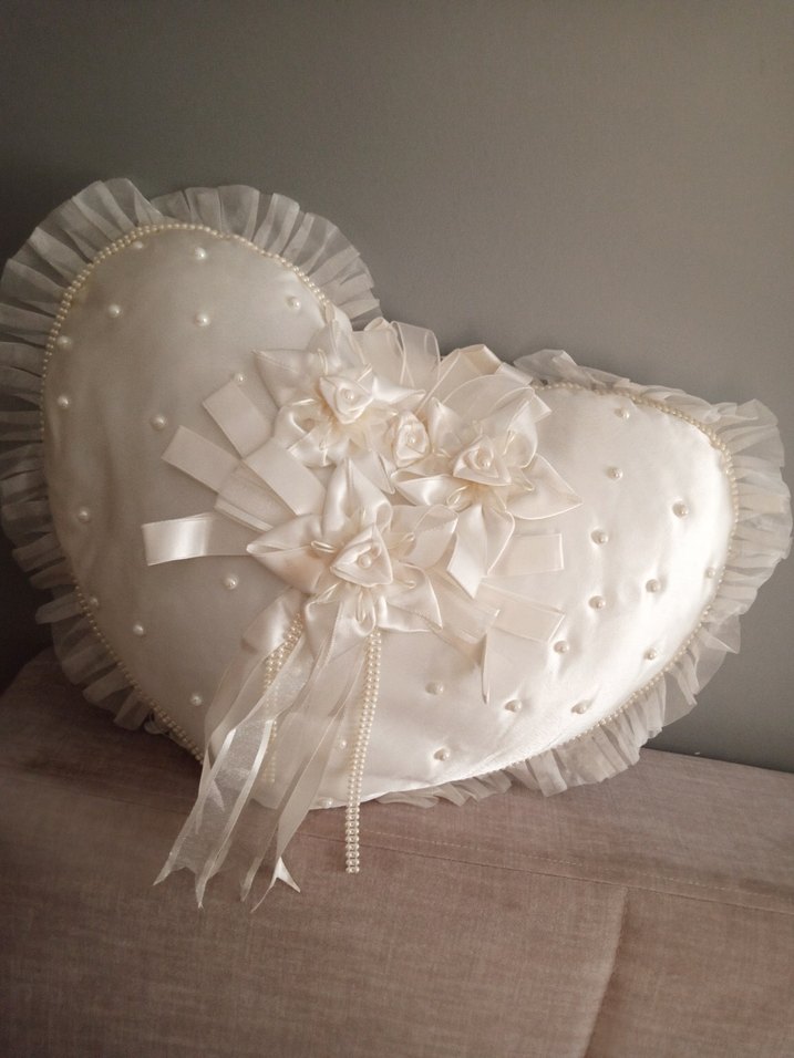 Klasik zarafet ve vintage tarzı yansıtan, saten güller, inciler ve kurdelelerle süslenmiş beyaz kalp şeklinde fırfırlı yastık.