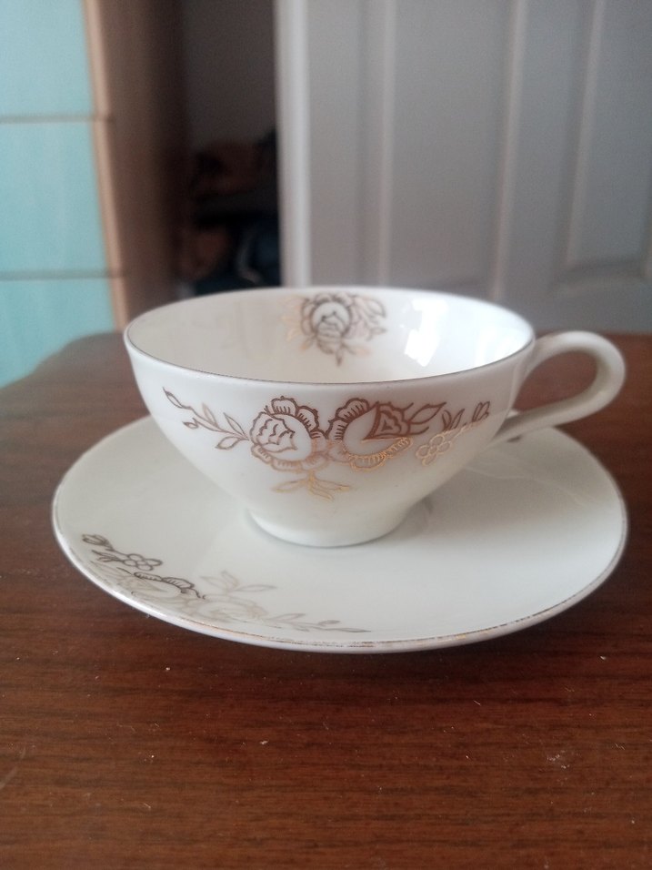 Vintage beyaz porselen fincan ve tabağı, üzerinde zarif gri gül desenleri bulunur. ☕