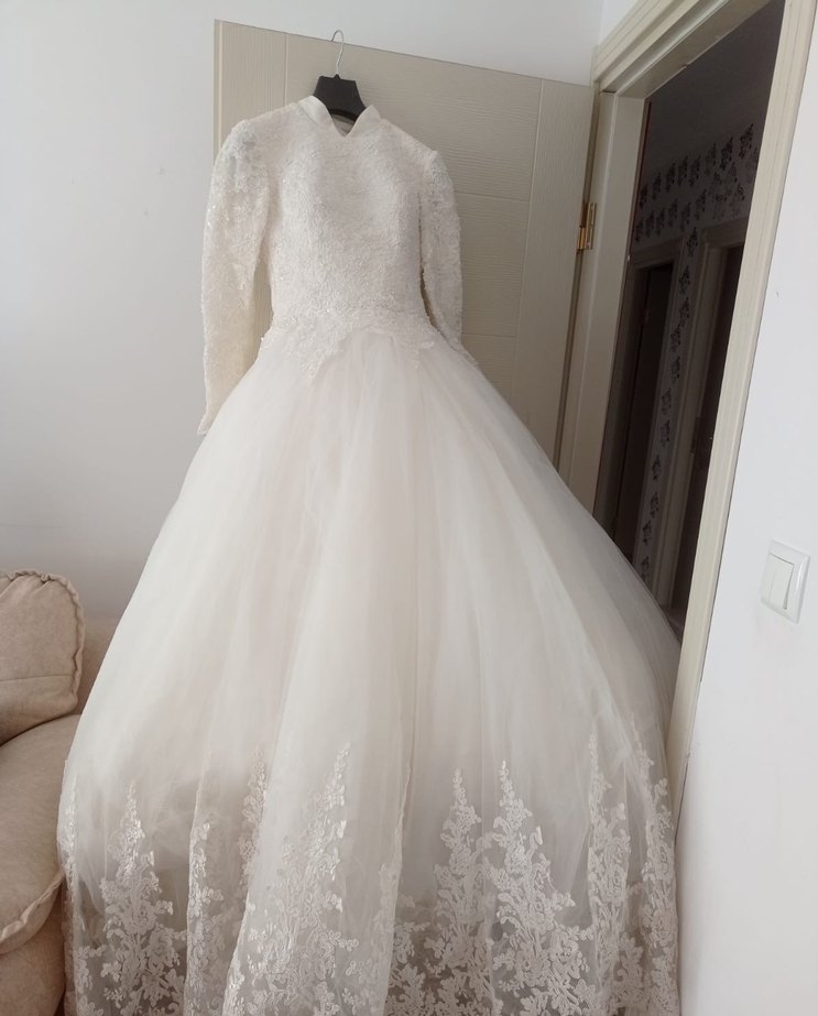 Vintage tarzda beyaz gelinlik, uzun kollu ve oturaklı üst kısmıyla dikkat çeker. Straplez yaka ve dantel işlemeli geniş etek prenses silueti oluşturur. Özel dikim ve özel tasarımdır