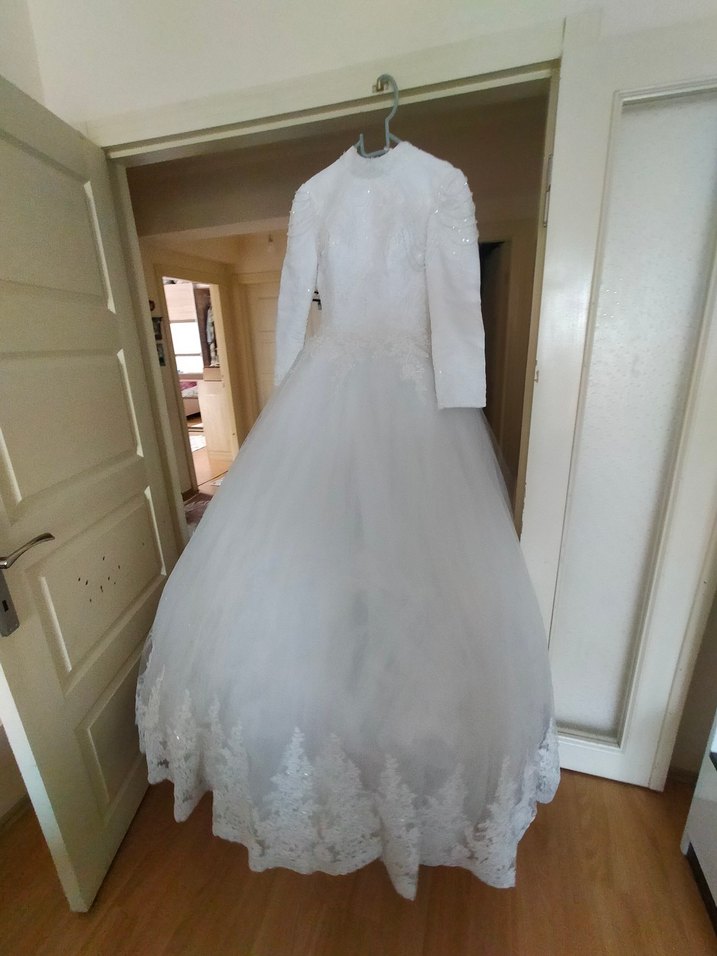 Vintage tarzda, yüksek yakalı ve uzun kollu, vücuda oturan beyaz gelinlik. Etek ucu dantel detaylı, uzun ve kabarık etekli. Klasik ve zarif bir seçim. kuru temizleme gerekir duvagida var arkası iple ayarlanır ama ipi yok