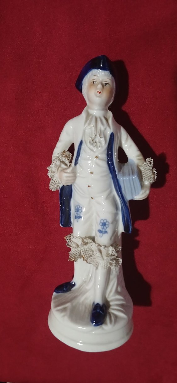 porselen detaylı beyaz figürin, sepet tutan geleneksel kıyafetli bir kişiyi tasvir eder. Dantel süslemelidir.ortalama 25 cm