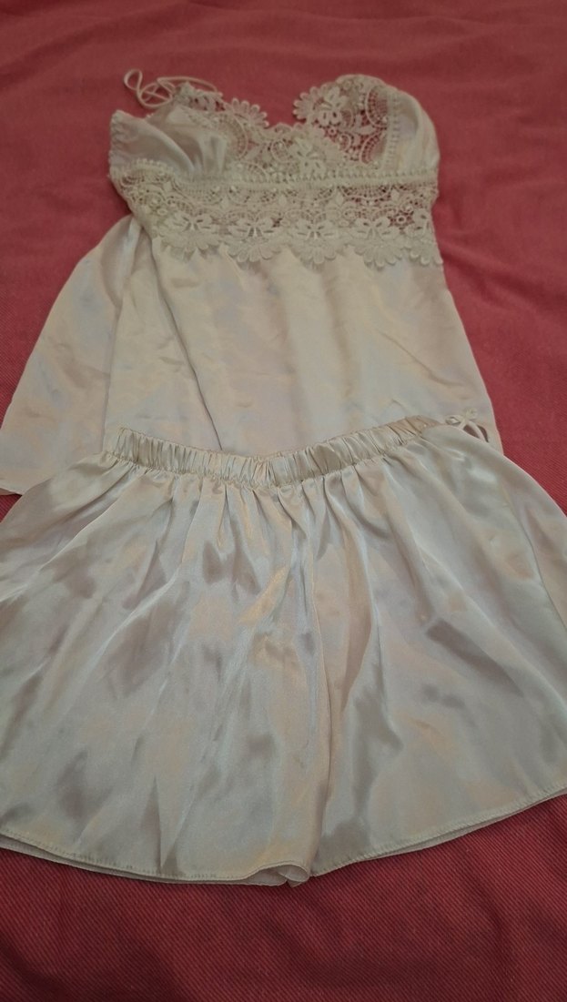 Kadınlar için parlak beyaz kumaştan, dantel detaylı vintage bohem tarzı, kolsuz ve bol kesim kısa pijama takımı. iyi durumda temiz 4 parça iadesi yoktur ona göre alın