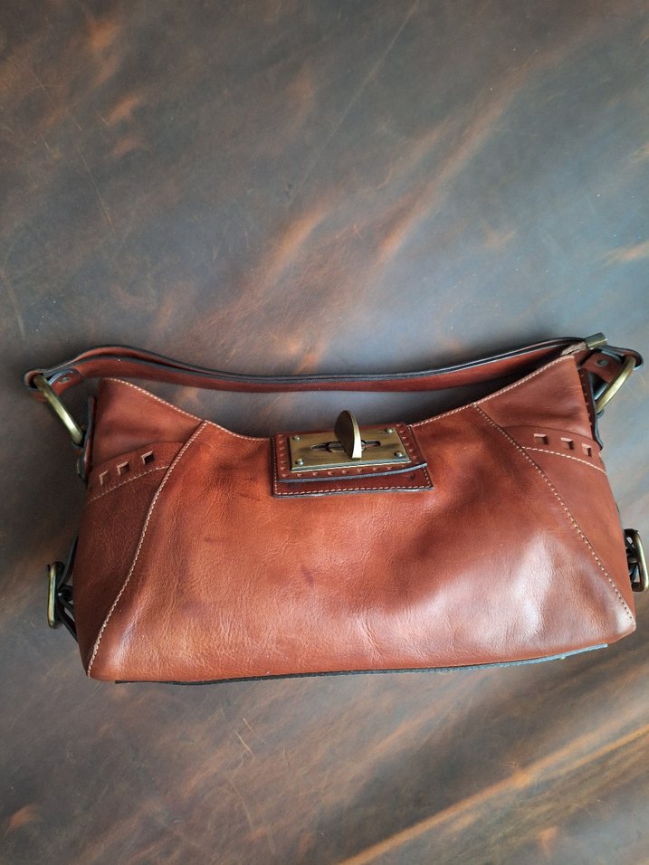Desa. Koyu renkte, tokalı kapamalı, bohem vintage tarzında deri kadın çantası. Düz, desensiz yüzeye sahiptir ve günlük kullanıma uygundur.