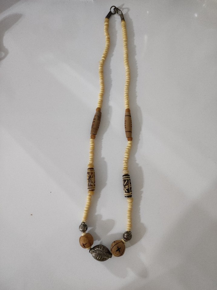 1970 li yıllara ait #Vintage bir ürün. Az kullanılmış temiz ve hasarsız bir ürün hiç bir sorunu problemi deformesi yoktur. Bej tonlarda etnik desenli boncuklu uzun kolye, renkli detaylara sahip. Zamana meydan okuyan bir ürün. Oldukça şık zarif ve tasarım bir ürün. Günlük kullanıma uygun bohem tarzda. 30 cm uzunluğunda.