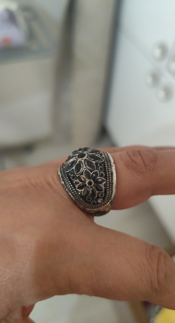 Gri vintage erkek yüzük, detaylı çiçek desenleriyle bohem ve retro stile uygun. Özgün ve şık bir görünüm sunar.