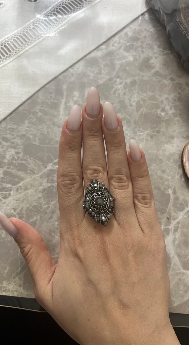 Vintage tarzda, gri payetli ve desenli bohem kadın yüzüğü. Düğün gibi özel anlar için uygun bir tasarıma sahiptir.