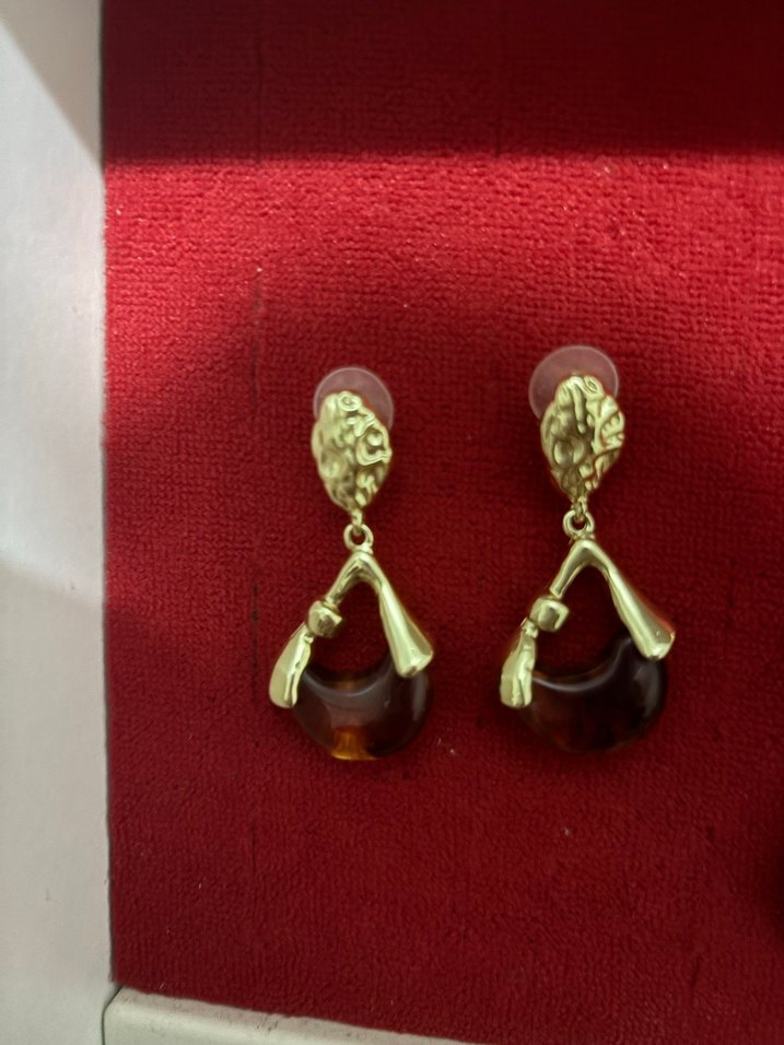 Altın renginde, etnik desenli bohem tarz kısa küpeler. Tokalı detaylarıyla vintage bir görünüm sunar, romantik akşamlar için uygundur.