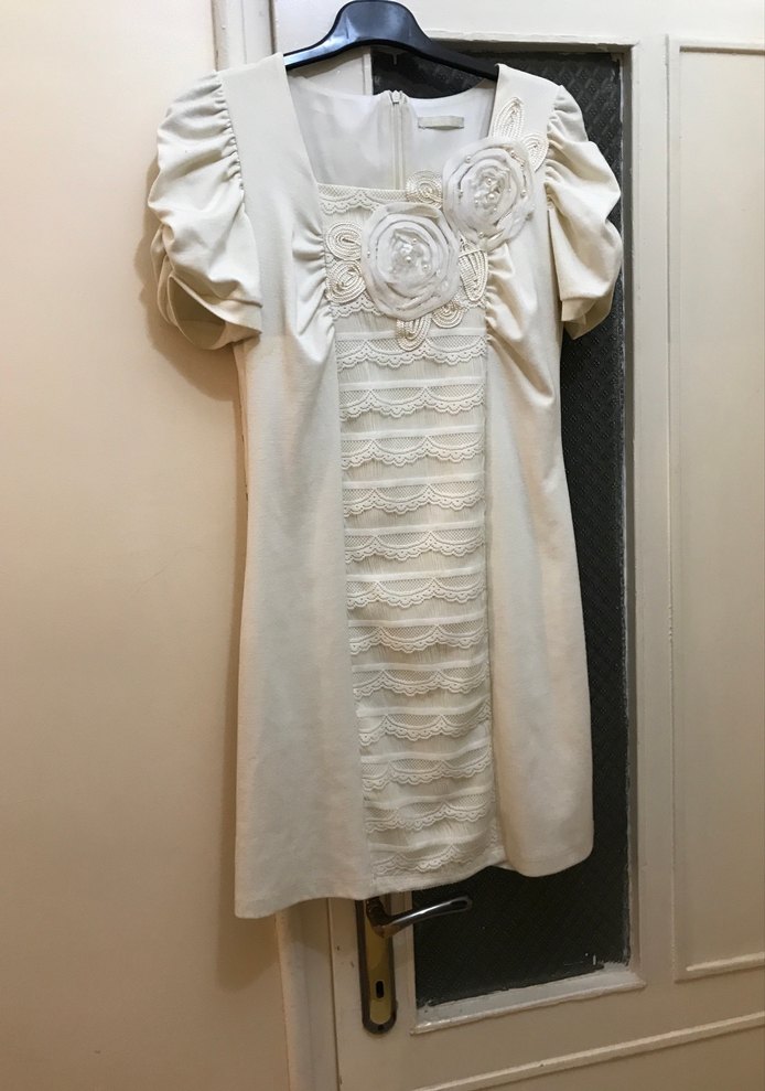 Beyaz mini gelinlik, kısa kabarık kollar ve yuvarlak yaka ile bol kesimdir. Ön kısmında vintage dantel ve çiçek detayları bulunur, bohem tarzı yansıtır.
