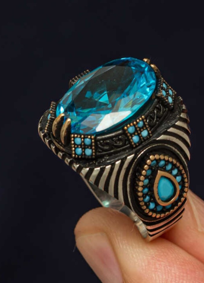 Büyük turkuaz taş ve detaylı vintage desenlerle renkli bohem tarzını yansıtan erkek yüzük.