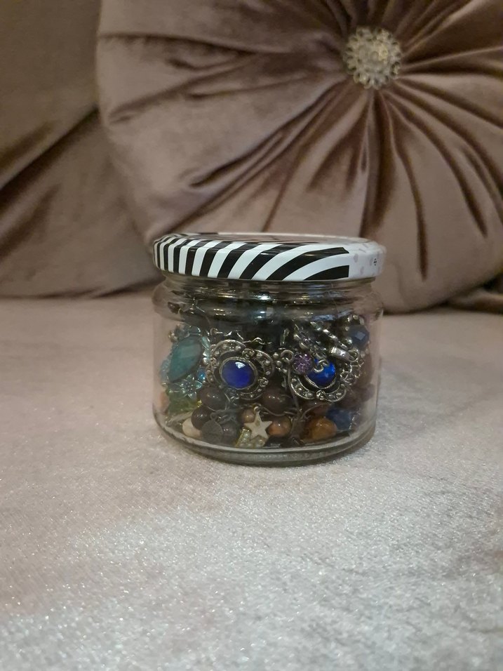 Vintage tarzda ve çeşitli tasarımlarda takılar içeren küçük bir kavanoz.