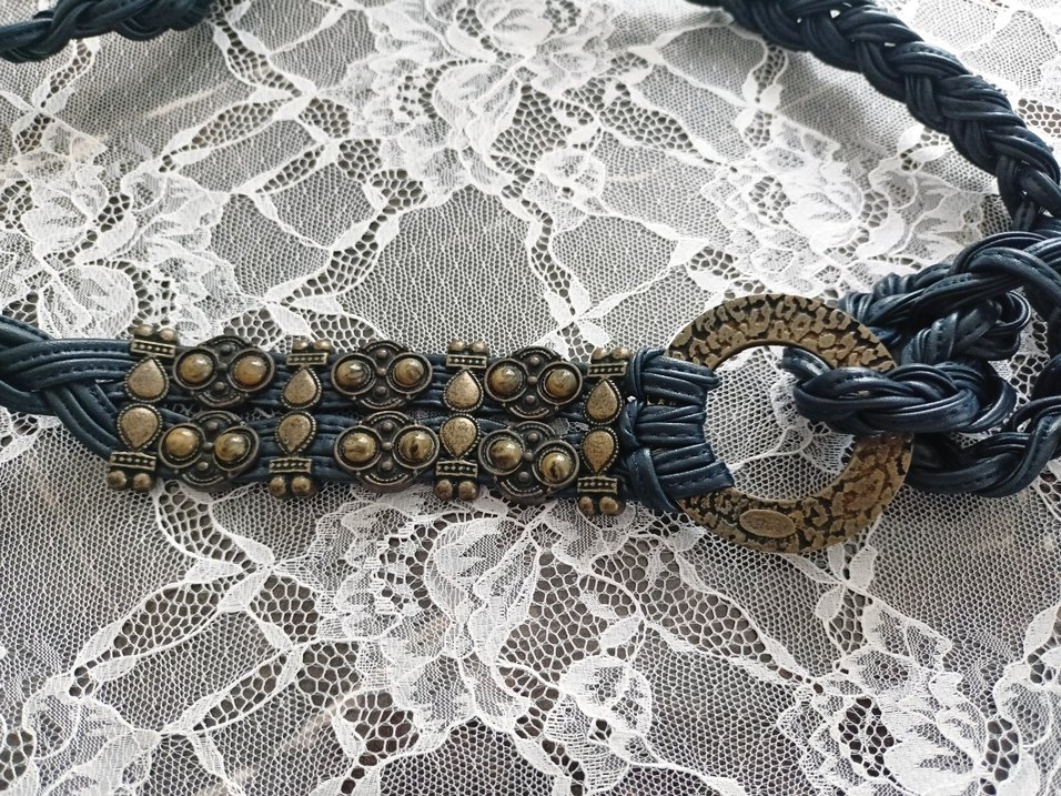 Bohem tarzı yansıtan koyu mavi örgü kemer, vintage görünümlü metal detaylı tokasıyla tamamlanır. sorunsuz boy 120 cm