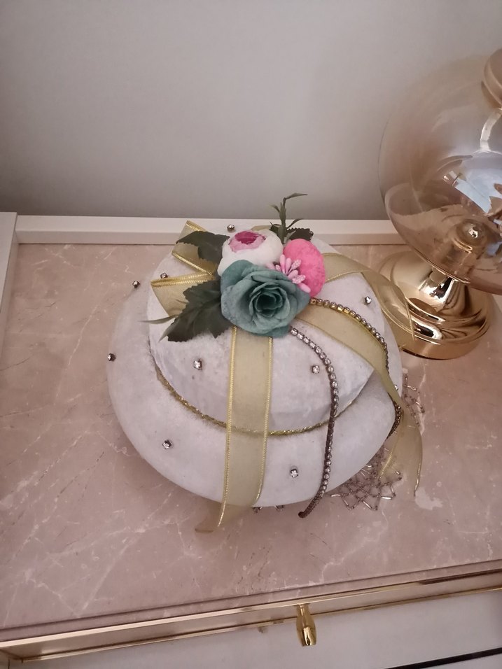 Vintage tarzı beyaz düğün aksesuarı, pastel renkli fiyonk ve çiçek süslemeleriyle klasik zarafeti bohem şıklıkla buluşturur.