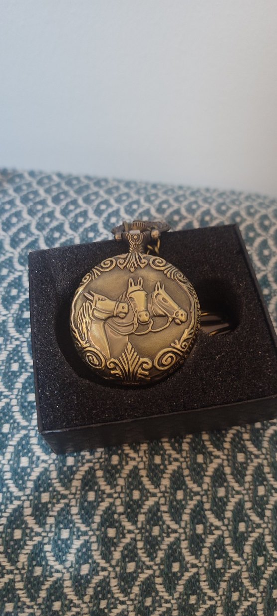Bohem tarzda, koyu altın renkli erkek cep saati, kapağında iki at kabartması bulunan vintage görünümlü saat. ⌚
