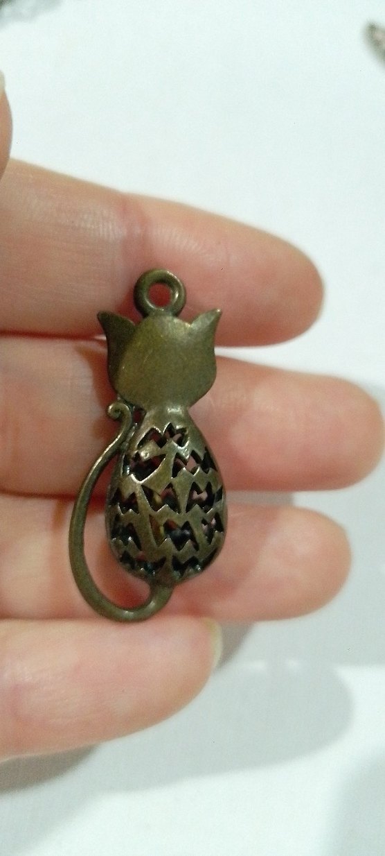 Vintage Bohem tarzda, kahverengi ve desenli boşluklu kedi figürlü kolye ucu, evde rahat kullanım için uygundur.