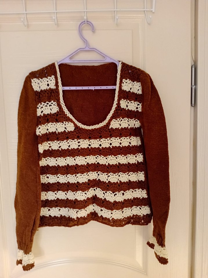 Kahverengi, uzun kollu, bol kesim örgü kadın kazak. Kayık yaka ve çizgili desenle bohem tarzı ve rahatlığı bir arada sunar. Klâsik giyim