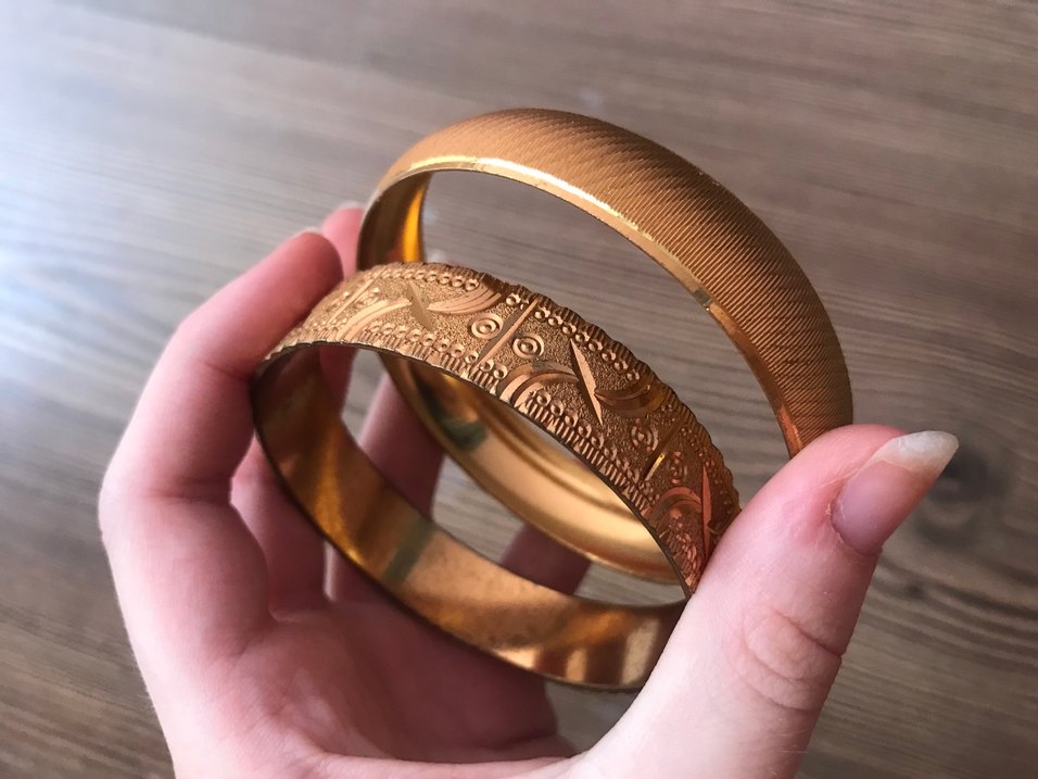 Parlak altın renkte, vintage bohem tarzı, bilezikler.