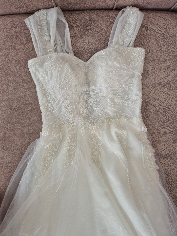 Bu vücuda oturan A-kesim gelinlik, straplez yakaya ve uzun, akışkan eteğe sahiptir. Vintage bohem tarzı, zarif dantel detaylarıyla klasik şıklık sunar.