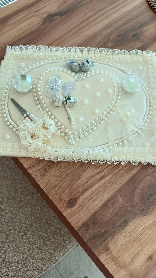 Vintage tarzda, boncuk detaylı beyaz düğün aksesuar seti. Dantel kenarlı, klasik ve zarif bir görünüm sunar. İçinde makas, mumlar ve süslemeler bulunur.