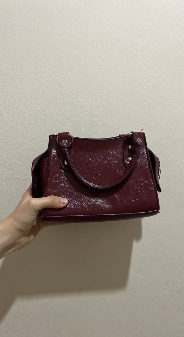 Parlak bordo deriden yapılmış, tokalı vintage tarzda kadın çantası. Desensiz ve minimalist görünüme sahip, günlük kullanım için uygun.