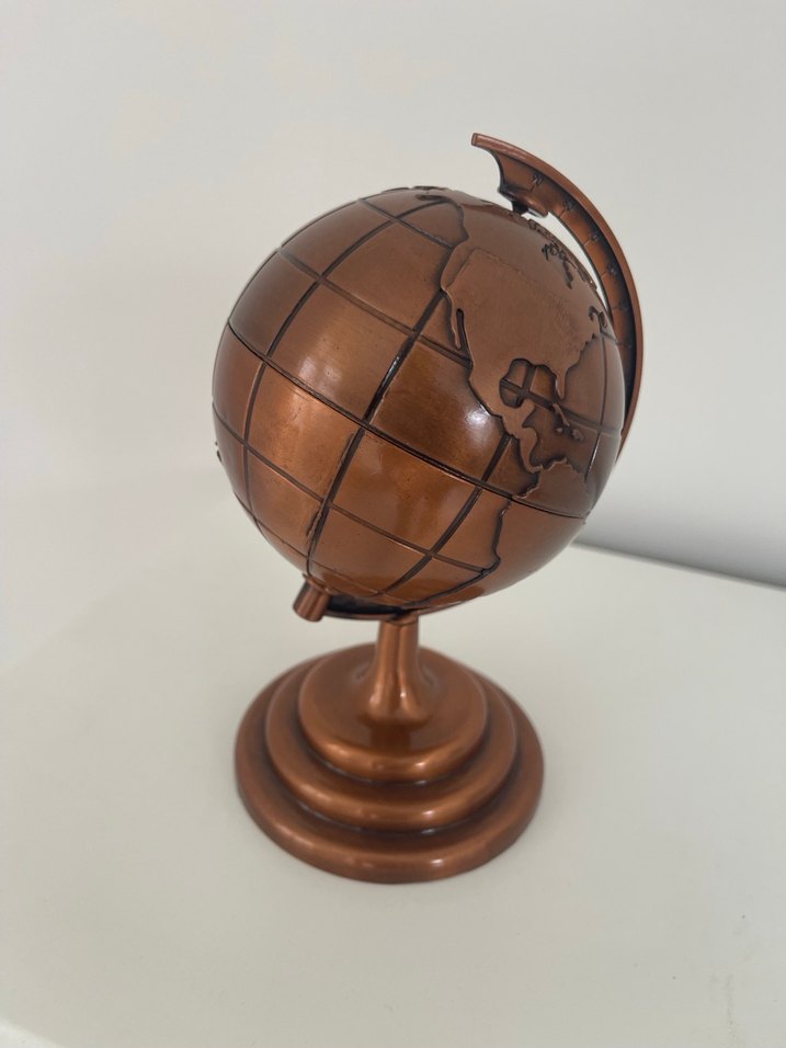 Detaylı kıtalarla parlak kahverengi dünya küresi biblo, basamaklı yuvarlak taban üzerinde duruyor.