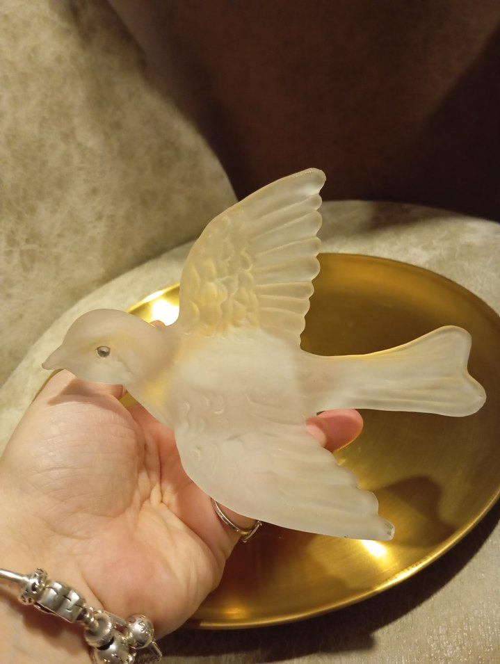 Vintage cam kuş biblosu, göz olarak swarovski taşlar kullanılmıştır. Kanadında pek belli olmayan çok ufak bir atık mevcut, son fotoda gösterilmiştir. Çok nadir ve güzel bir obje. Büyüklüğü 2.fotoda gösterilmiştir