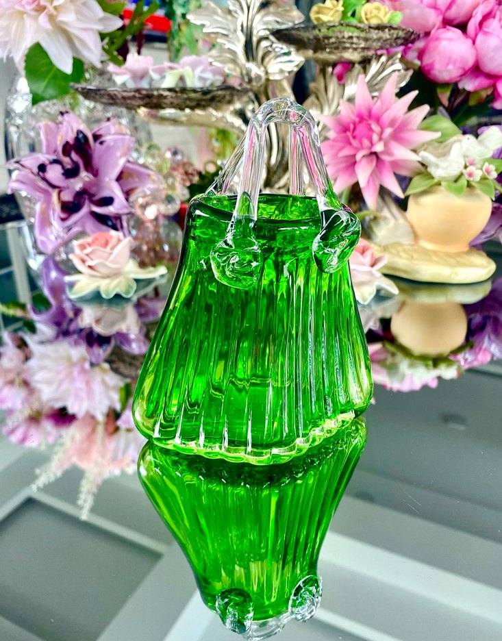 Tahmini 1970’lerde Almanya’da üretilen, dönemin cam sanatını yansıtan, el yapımı, dekoratif, kulplu mini sepet/vazo. Canlı zümrüt yeşili rengi ve şeffaf cam aplike kulplarıyla dikkat çeken, çok şık bir parça. Ölçüler: U 11 cm., G 6,7 cm., Y 14 cm. Ürün kodu: 0693 İADE ve DEĞİŞİM YOKTUR #murano #camsanatı #yeşil #vazo #minivazo #zümrütyeşili #dekor #vitrin #elyapımı #camvazo #hediye #konsol #sunum
