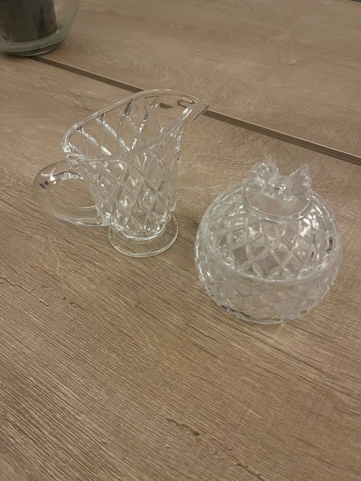 Vintage tarzda, klasik dokulu beyaz camdan yapılmış kapaklı şekerlik ve kulplu sütlük seti. Sofranıza zarif bir dokunuş katar. ️