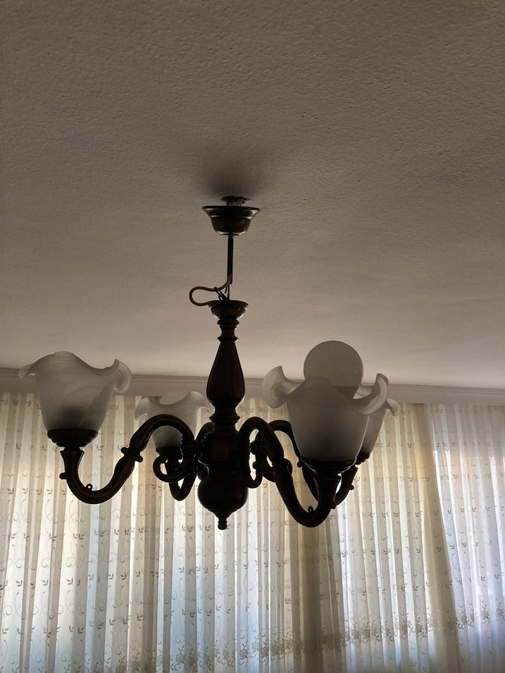 Koyu metal gövde ve çiçek şeklinde bej buzlu cam abajurlu klasik avize. 20 yıllık hicbir sorunu olmayan avize.
